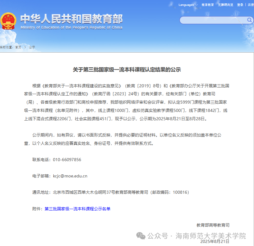 近日,教育部公布第三批国家级一流本科课程认定结果,经高校申报推荐、省级教育行政部门审核、专家网络评审和会议评审,认定5999门课程为国家级一流本科课程。美术学院卢向玲教授主持的《中国花鸟》课程入选线上线下混合式一流课程,也是我院第二门国家一流本科课程。