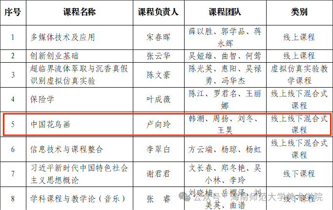 近日,教育部公布第三批国家级一流本科课程认定结果,经高校申报推荐、省级教育行政部门审核、专家网络评审和会议评审,认定5999门课程为国家级一流本科课程。美术学院卢向玲教授主持的《中国花鸟画》课程入选线上线下混合式一流课程,也是我院第二门国家一流本科课程。