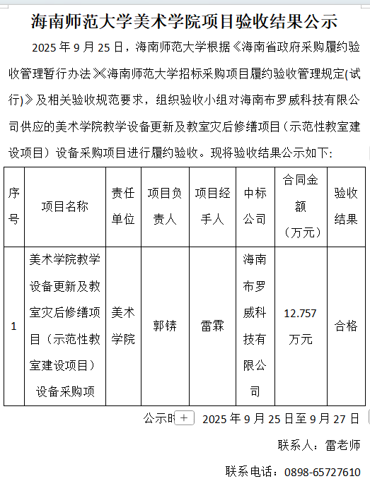 2025年9月25日,海南师范大学根据《海南省政府采购履约验收管理暂行办法》《海南师范大学招标采购项目履约验收管理规定(试行)》及相关验收规范要求,组织验收小组对海南布罗威科技有限公司供应的美术学院教学设备更新及教室灾后修缮项目(示范性教室建设项目)设备采购项目进行履约验收。现将验收结果公示如下: