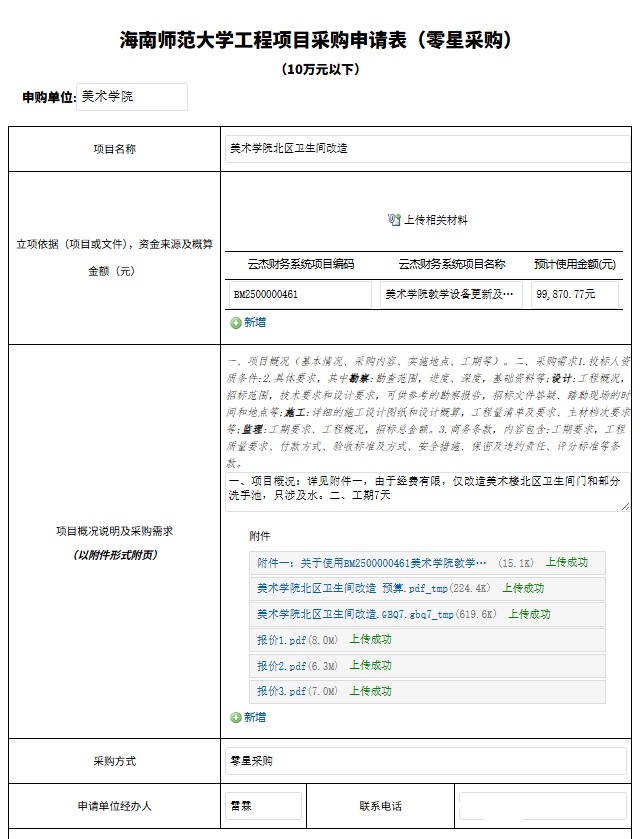 海南师范大学工程项目采购申请表(零星采购) (10万元以下) 美术学院北区卫生间改造